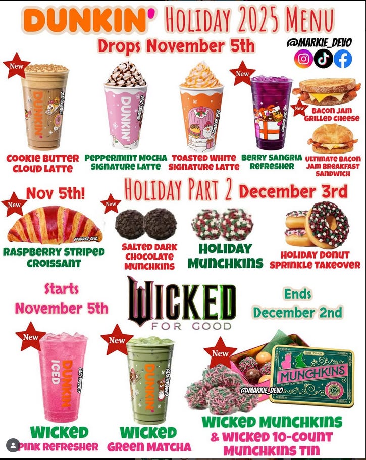 Come December 3, Munchkins mania hits with Salted Dark Chocolate Munchkins (think bite-sized bliss with sea salt crunch) and Holiday Munchkins in festive glazes. The Wicked collab tosses in themed Munchkins, turning snack time into a Broadway afterparty.