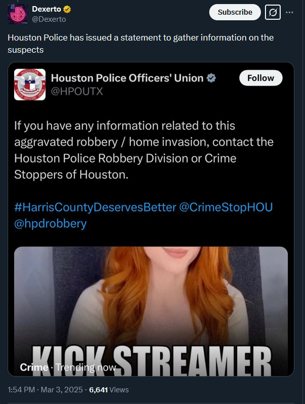 UPDATE - Houston Police seeking information on the break-in per Dexerto. Developing.