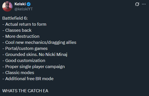 Early hands-on impressions highlight crisp movement, smarter AI bots for empty slots, and destruction that finally matches Battlefield Bad Company 2’s high watermark. But players burned by 2042 remain skeptical. YouTuber “Kelski” took to X to summarize his thoughts on the matter, as well as his concern that some sort of “catch” was on the way. Social feeds praise the trailer’s tone yet repeat one refrain: “show us at launch.”