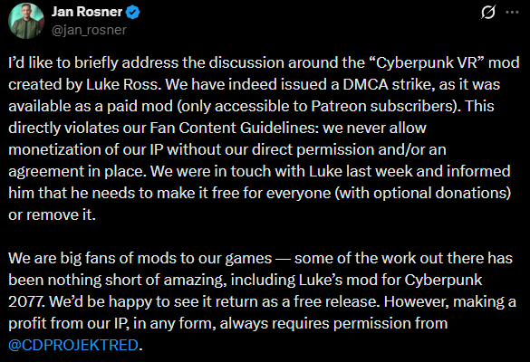 Modder’s Response: Luke Ross pulled the mod entirely rather than make it free, arguing it’s not derivative of CDPR’s IP.