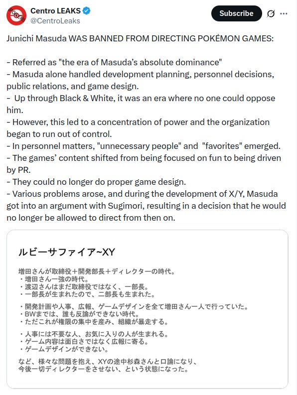The turning point came during X and Y’s development in 2013. According to the document, “various problems arose, and midway through XY, Masuda got into an argument with Sugimori, resulting in a decision that he would no longer be allowed to direct from then on.” Ken Sugimori, the iconic artist behind many Pokémon designs, clashed with Masuda over unspecified issues tied to the growing dysfunction.