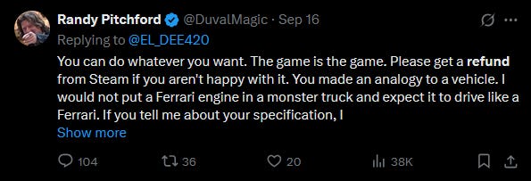 Enter Randy Pitchford, whose Twitter feed has become a battlefield. Responding to complaints about stuttering and low frames, he first pushed solutions like DLSS and frame generation, analogizing: "I would not put a Ferrari engine in a monster truck and expect it to drive like a Ferrari." When users dismissed the advice as inadequate, Pitchford doubled down: "I'm sorry you don't like being told to use DLSS, but that is the way. If you're not happy using the tools available to you to improve frame rate and you're not happy with the frame rate you have, you should play a different game." He capped it with: "Please get a refund from Steam if you aren't happy."