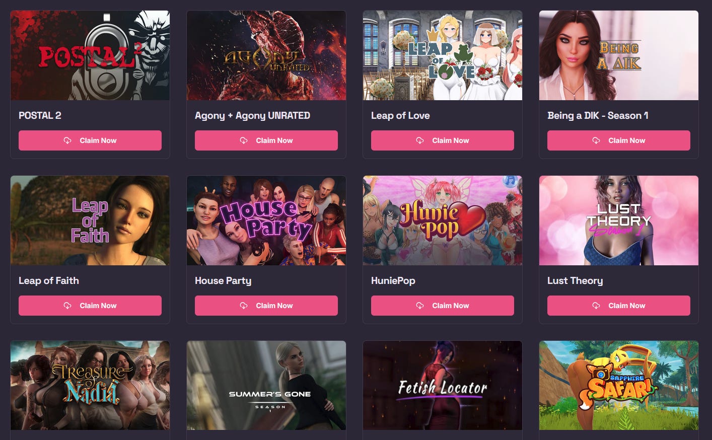 Highlighted titles include Leap of Love, Being a DIK – Season 1, and House Party—all games that routinely land in censors’ crosshairs.