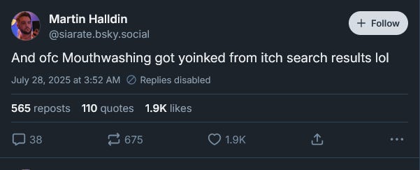 Mouthwashing Vanishes From Itch.io Search—Payment Processors Strike Again