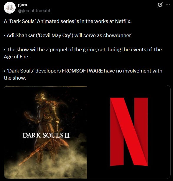 An X post from user @gemahtreeuhh announced a Dark Souls animated series for Netflix.