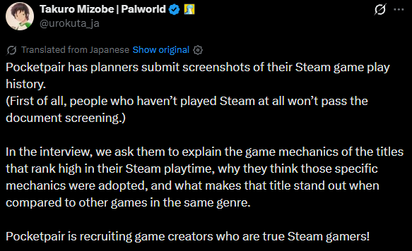 Candidates eyeing a game designer role at Pocketpair face an upfront hurdle. The studio asks for screenshots showing Steam playtime history right at the application stage. Mizobe stated on X that anyone without Steam experience gets passed over during initial screening.
