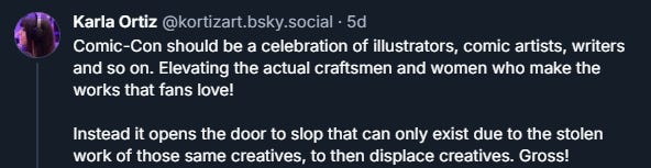 Karla Ortiz led the charge, emphasizing how AI displaces the very artists SDCC should honor. She wrote: