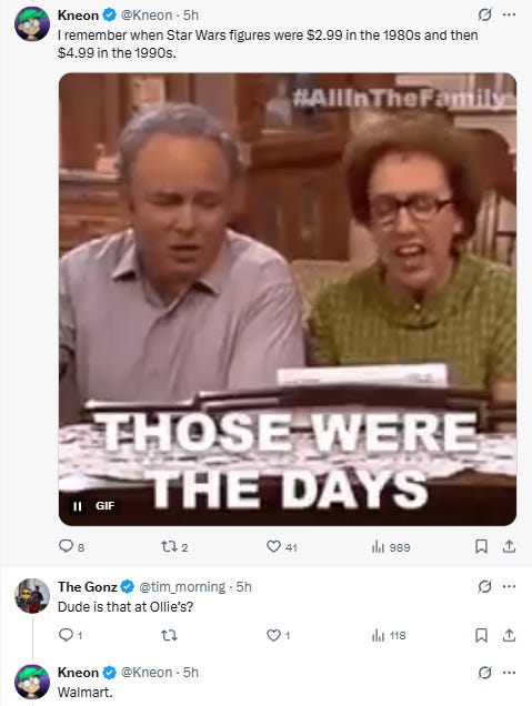 In the 1980s, original Kenner Star Wars figures sold for around $2.99 each. Adjusted for inflation, that’s about $11.60 in 2025 dollars, according to U.S. CPI data. Collectors like Kneon reminisced in his tweet: “I remember when Star Wars figures were $2.99 in the 1980s.”