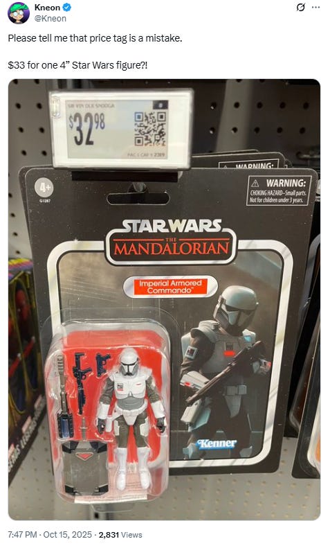 Star Wars action figure prices in 2025 have climbed to as high as $33 for a single 3.75-inch deluxe model, sparking outrage among collectors who remember much cheaper prices decades ago. A recent tweet from Kneon (editor of ClownfishTV.com and our fearless leader) showed a Hasbro Vintage Collection Imperial Armored Commando priced at $32.98 at Walmart. This article breaks down the price evolution, unsold inventory flooding discount chains, and the overall decline in Star Wars toy interest.