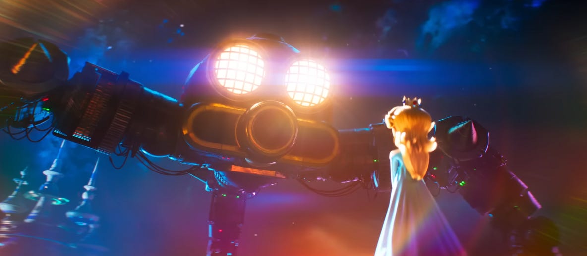 A dazzling set piece features Rosalina conjuring starlight with her wand, shattering a massive robot amid swirling cosmic debris—an early showcase of the sequel’s expanded scale and animation finesse.
