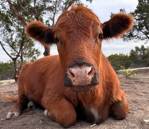 Winnie, a Red Angus at Alveus Sanctuary, streams on Twitch; donations activate her automatic feeder for instant treats.