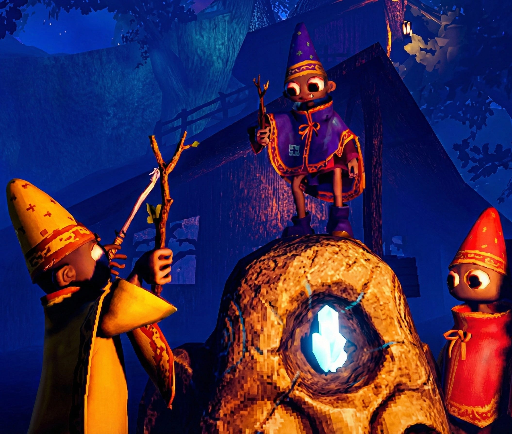 Chubby wizards in floppy hats scurry through purple-lit halls. One hurls a fireball that shatters a chandelier. Another yells a spell, turning a chair into flapping fish.